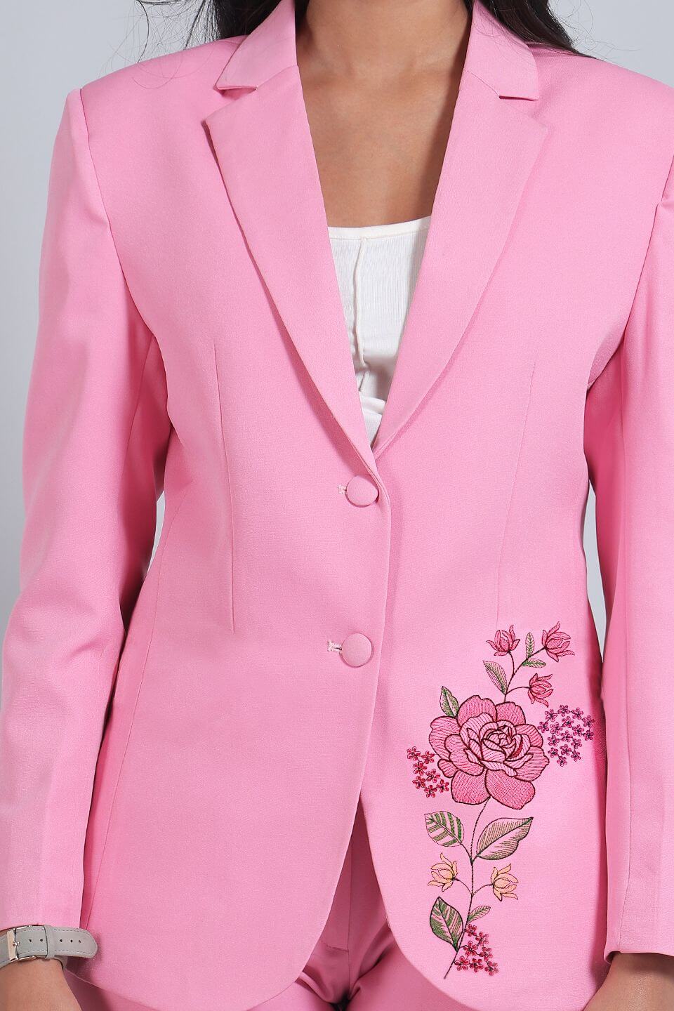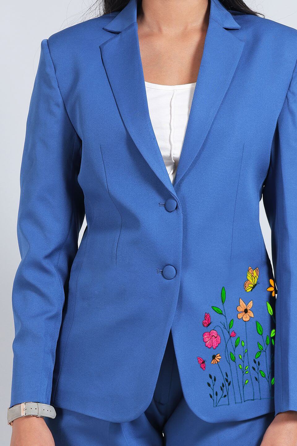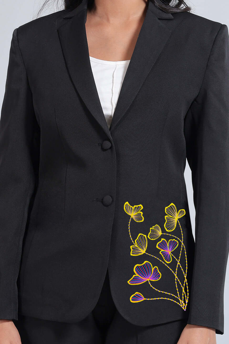 Polyester Cotton Black Blazer with Floral Embroidery