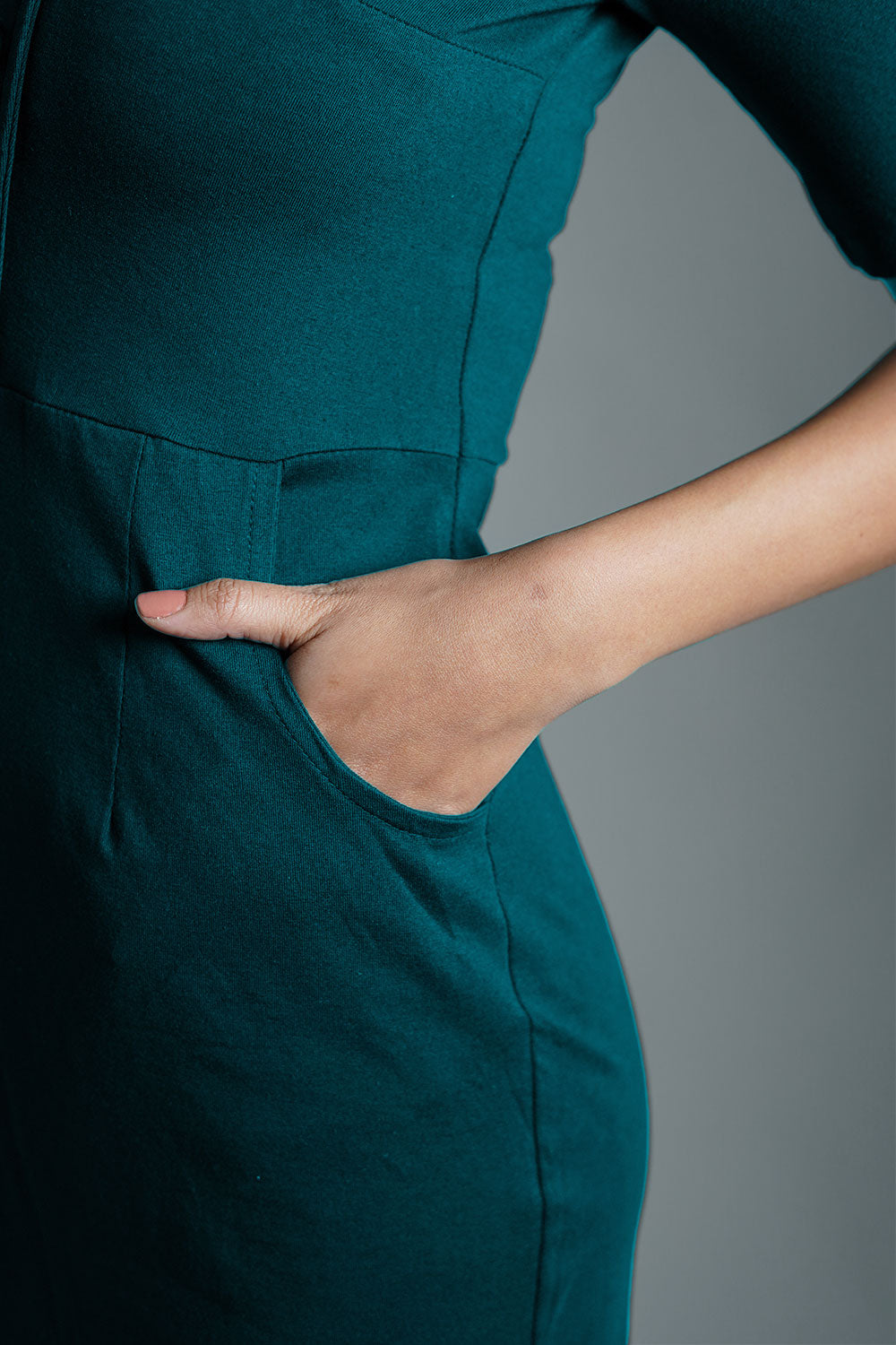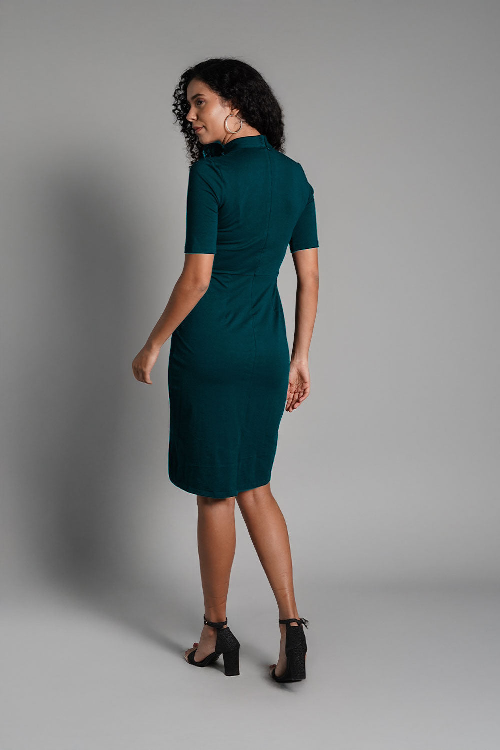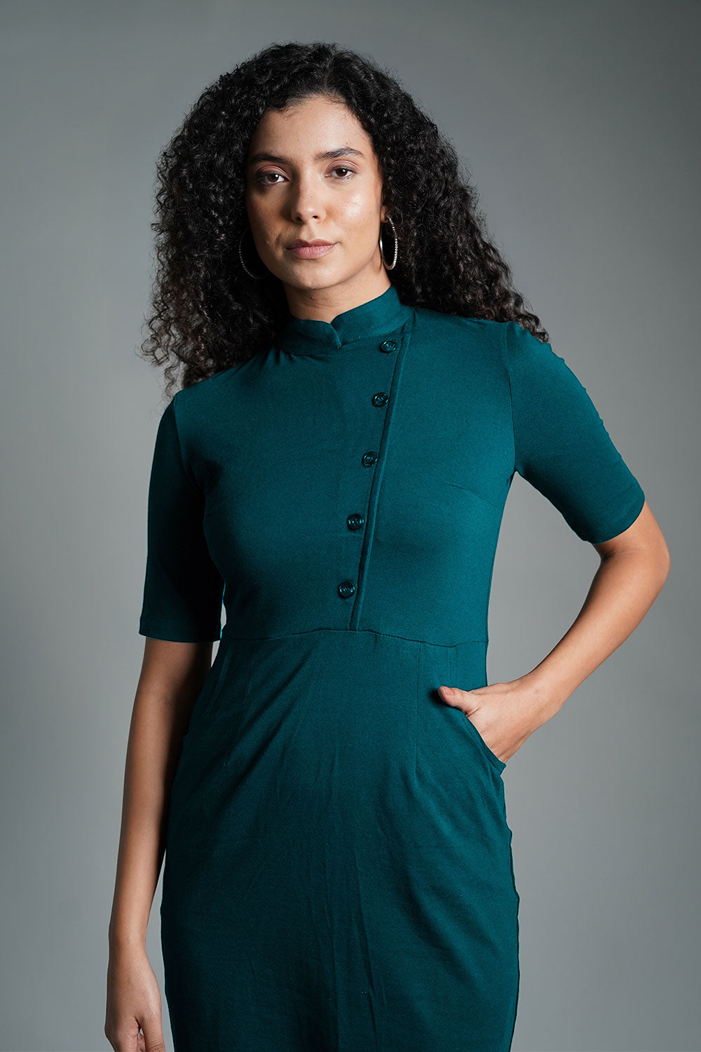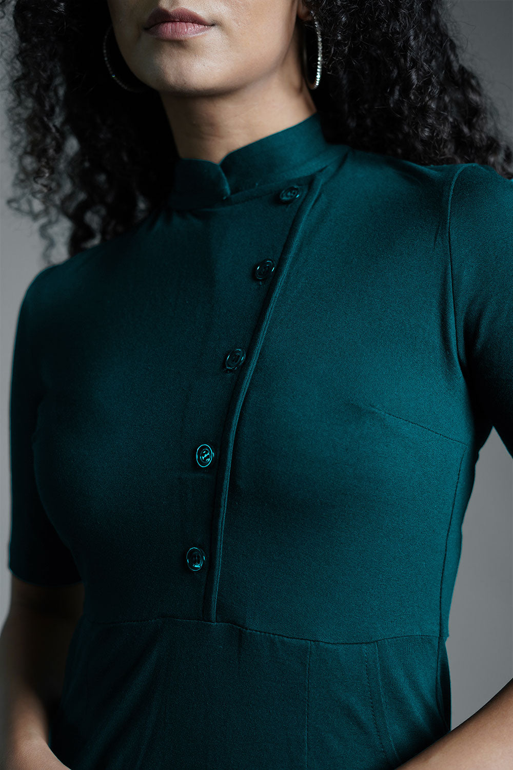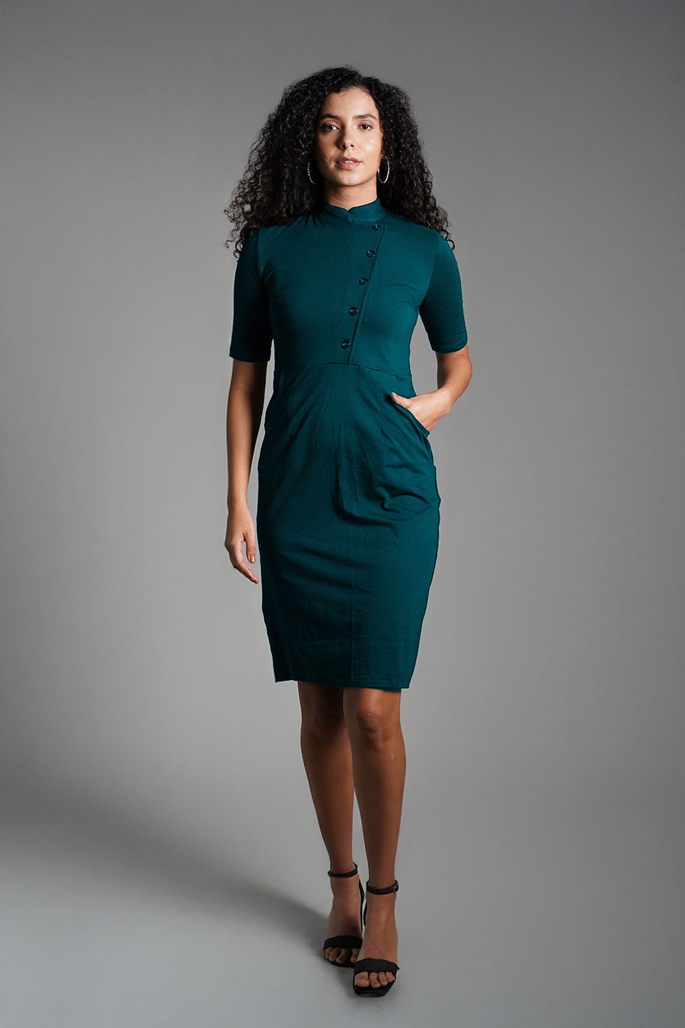 Faux Button Front Teal Cotton Jersey Sheath Dress