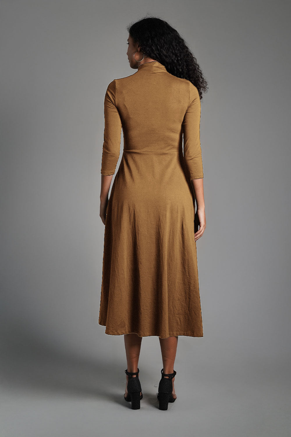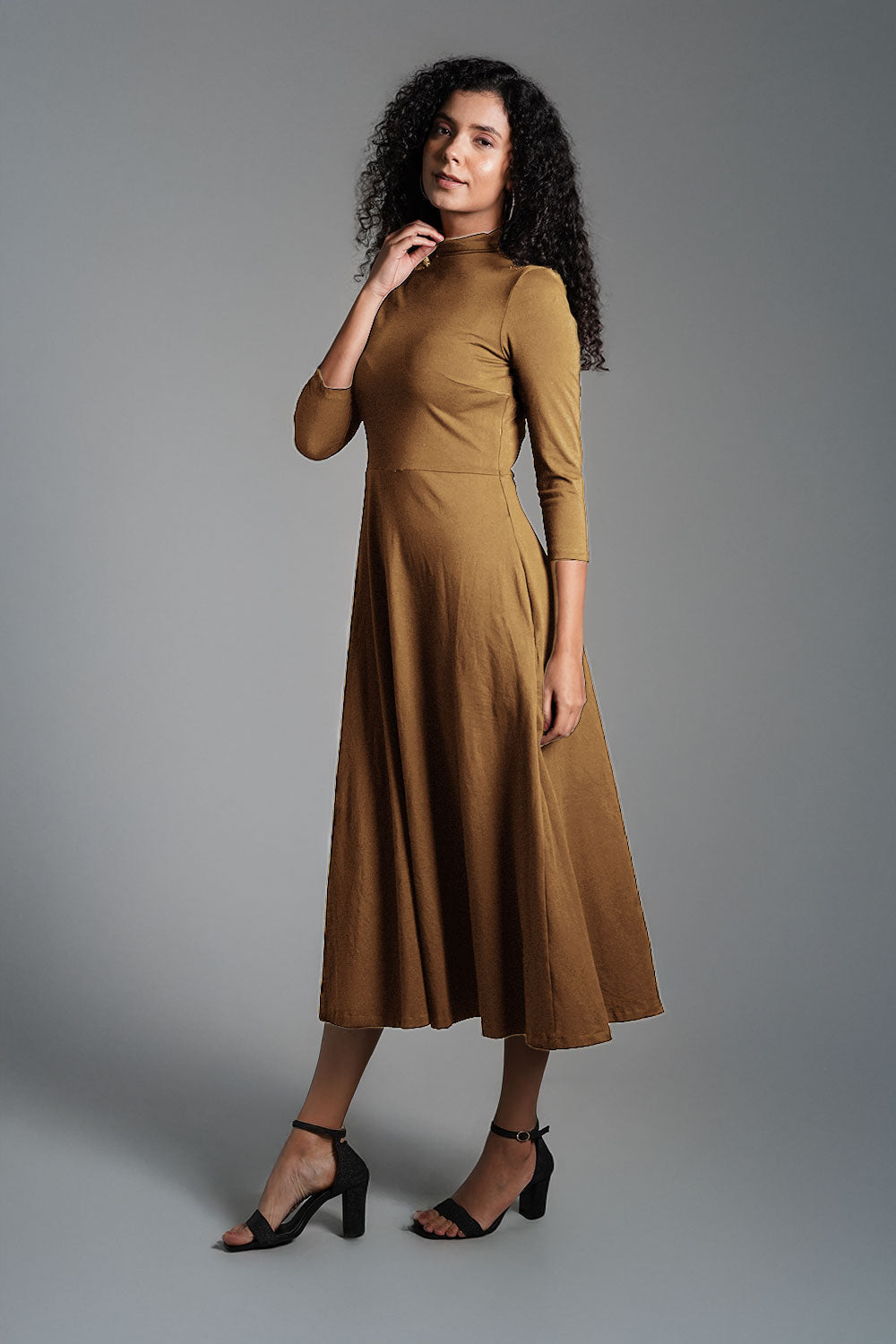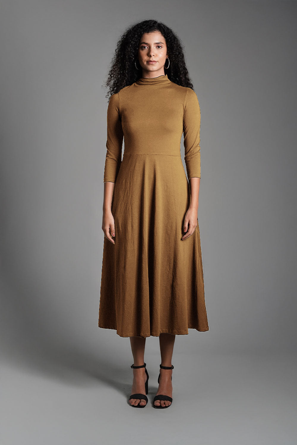 Beige High Neck Jersey Knit A-Line Dress