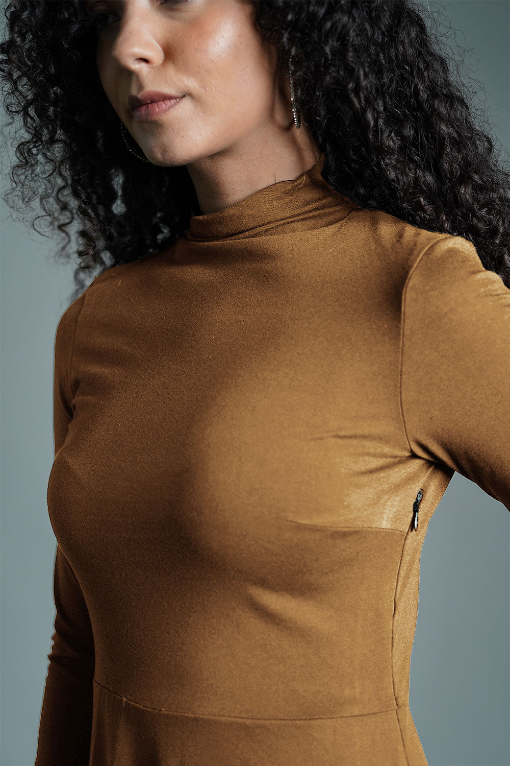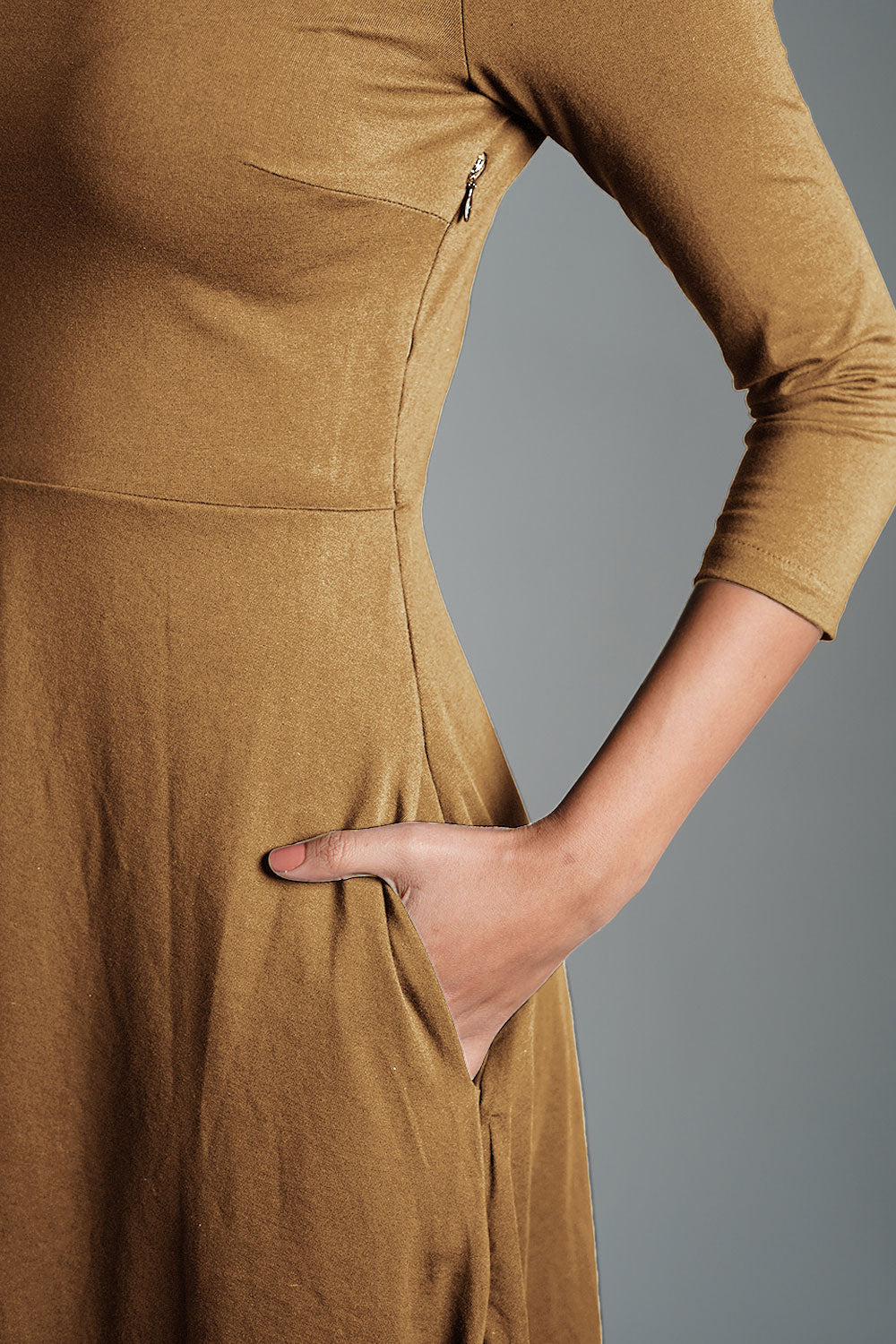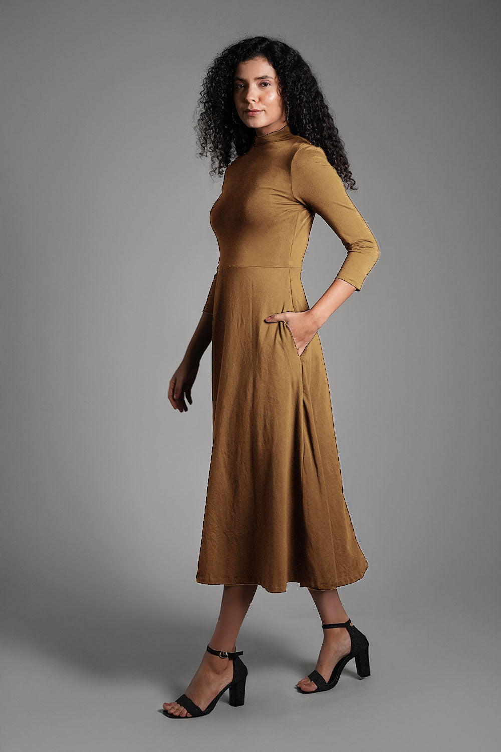 Beige High Neck Jersey Knit A-Line Dress