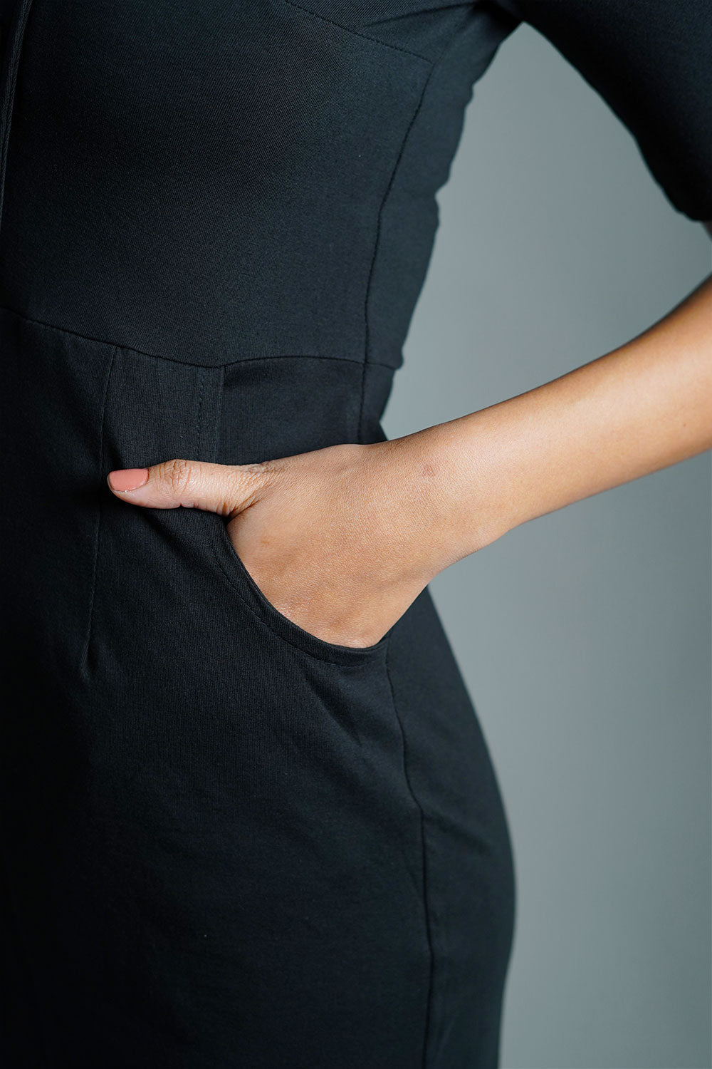 Faux Button Front Black Cotton Jersey Sheath Dress
