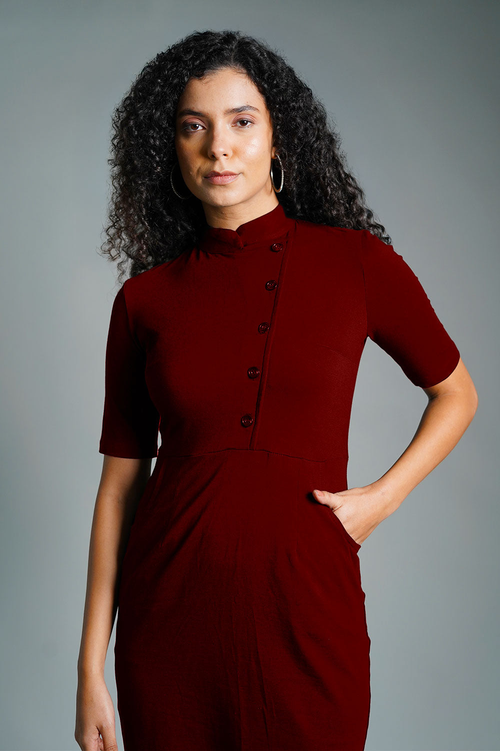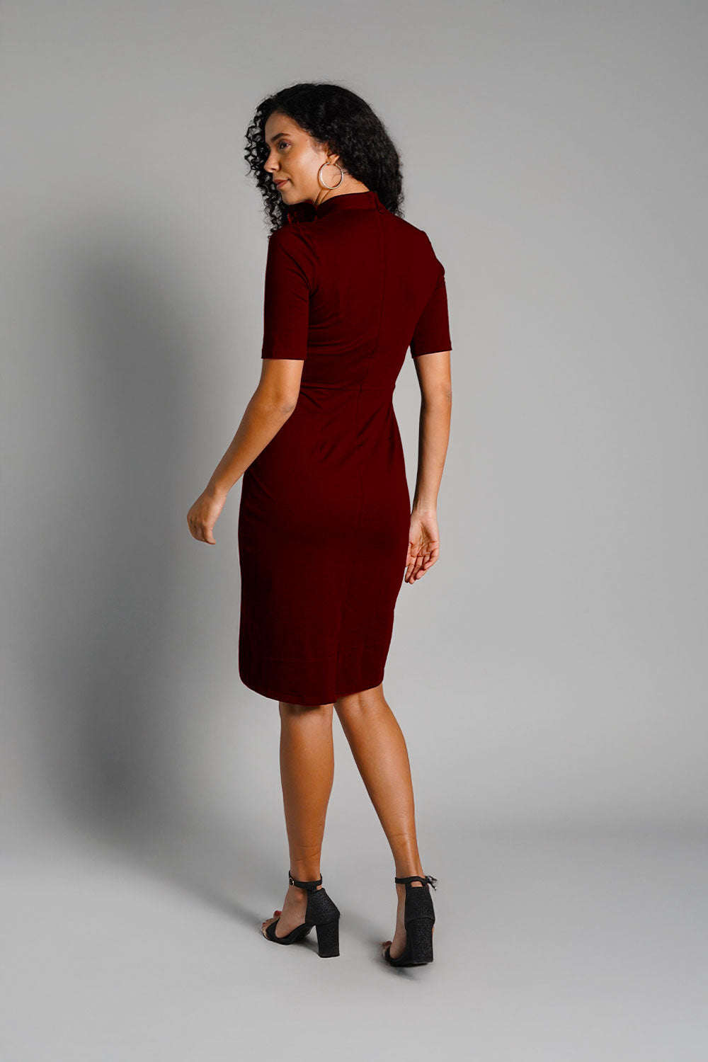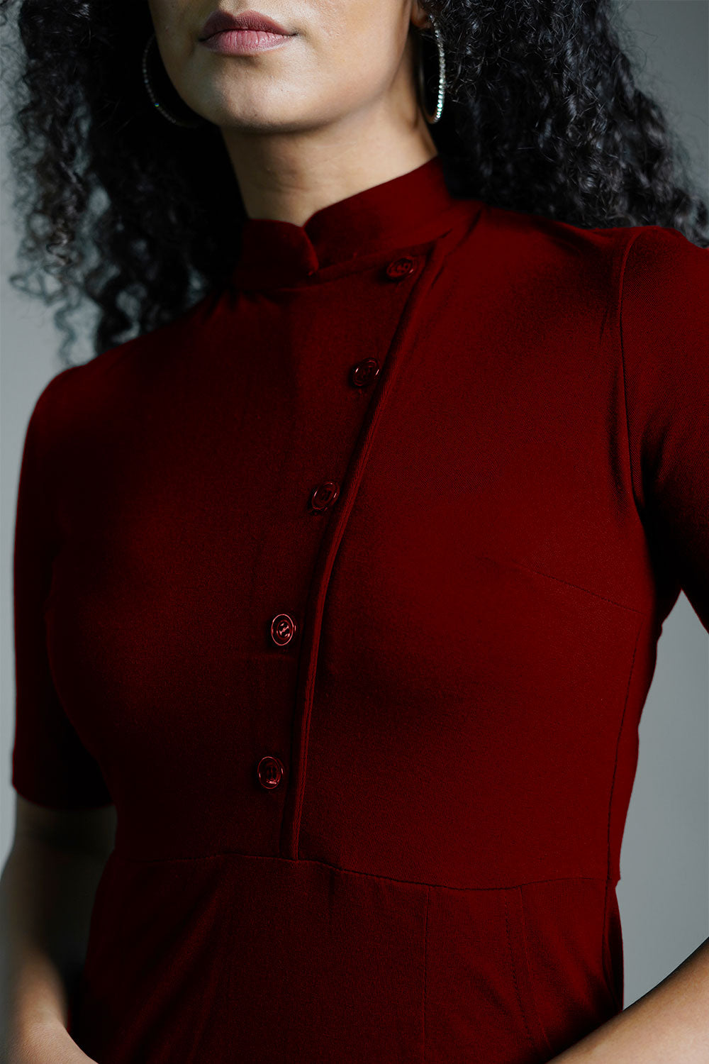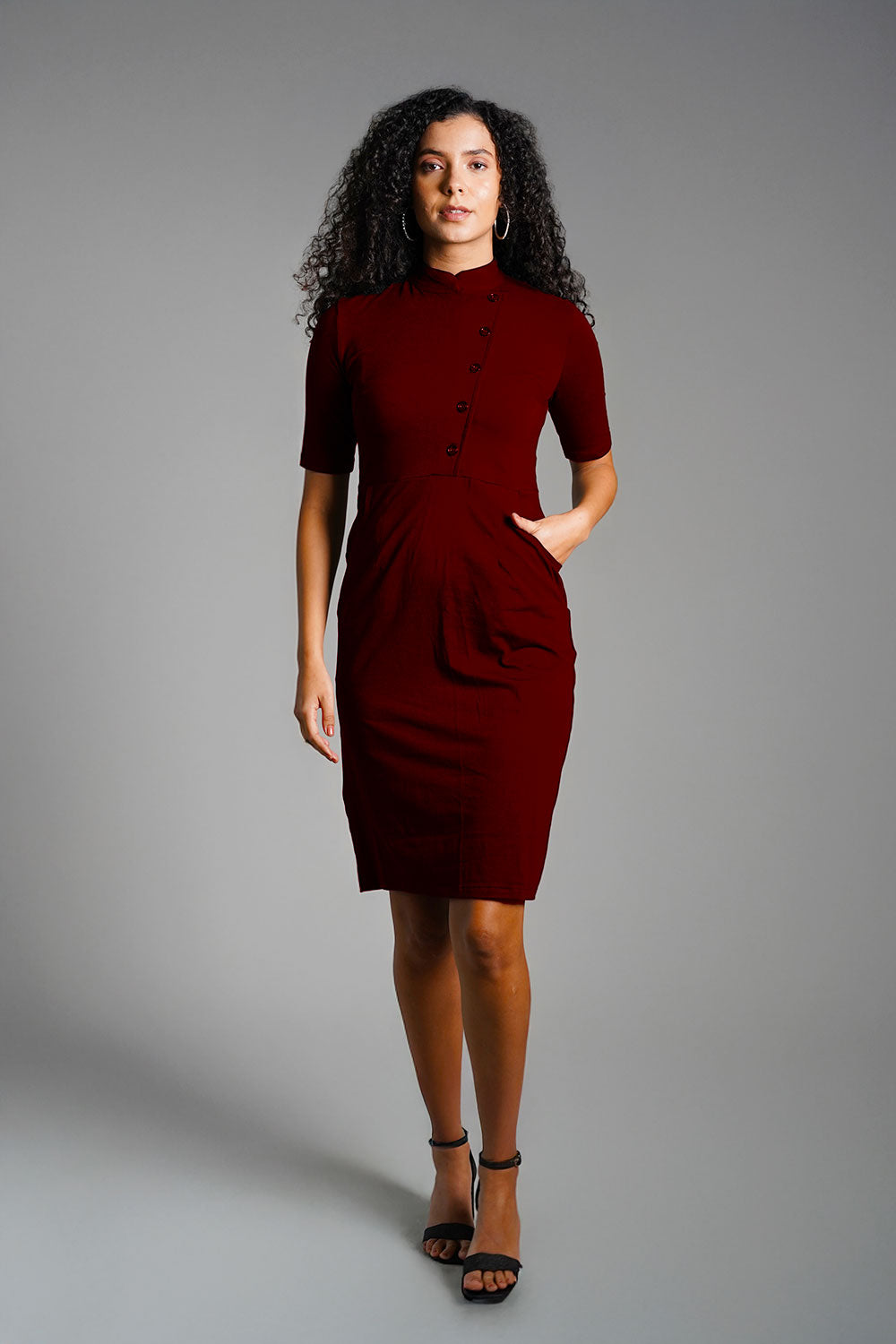 Faux Button Front Maroon Cotton Jersey Sheath Dress