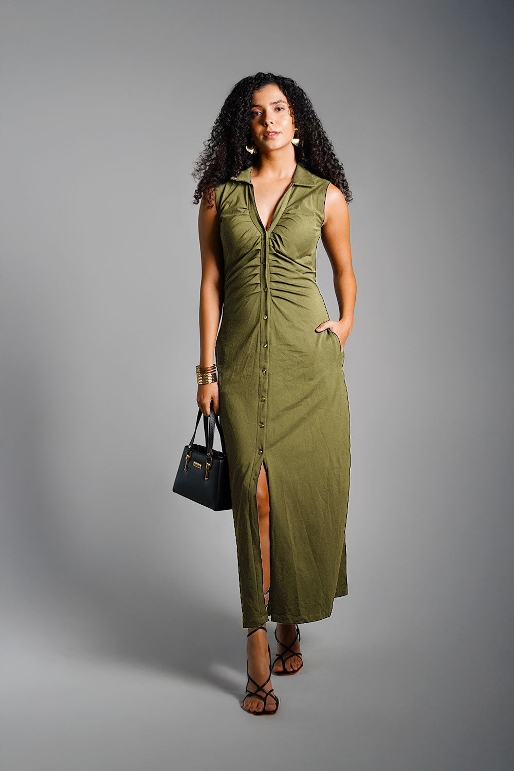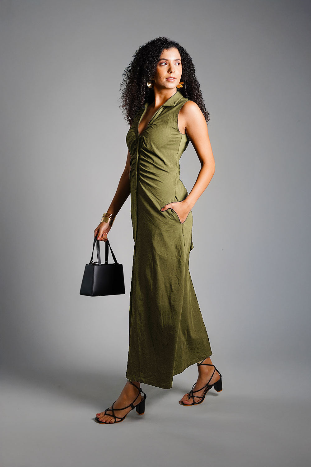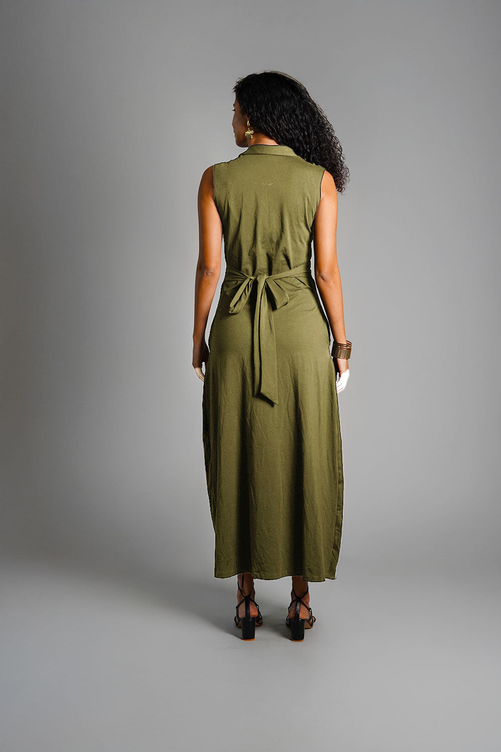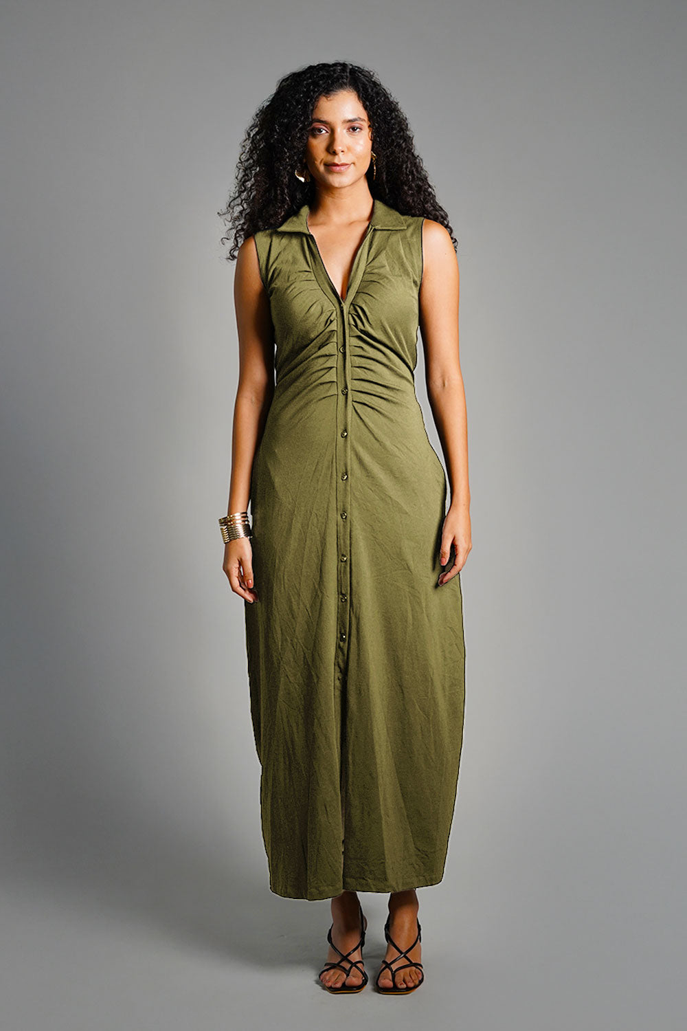 Olive Ruched Cotton Jersey Tie-Back Shirt Dress