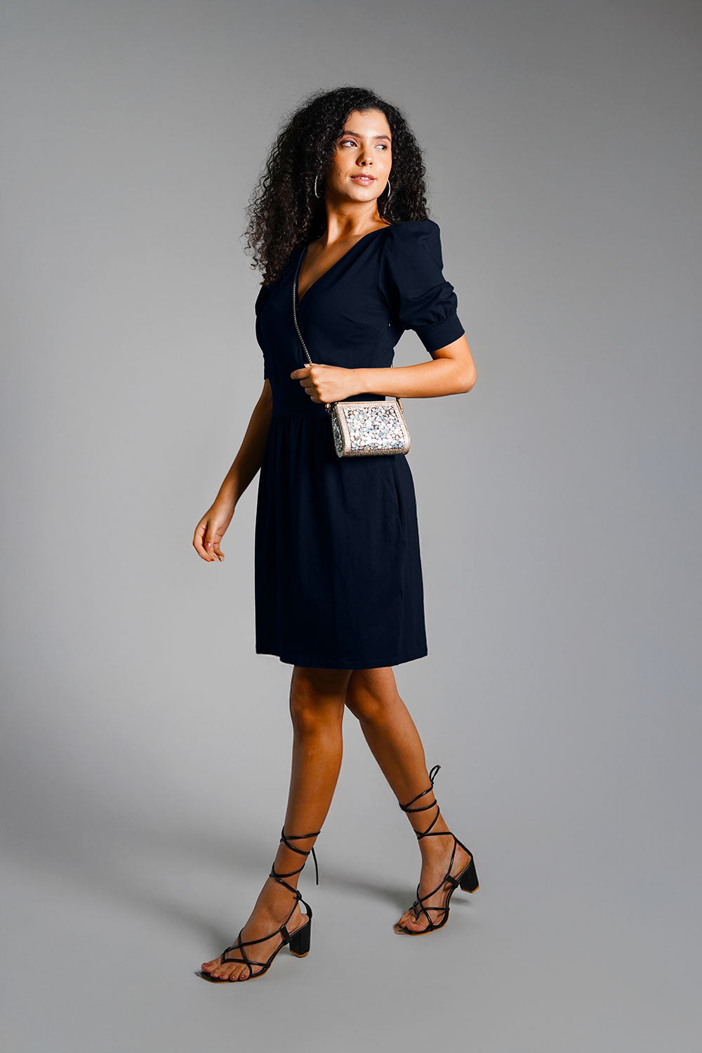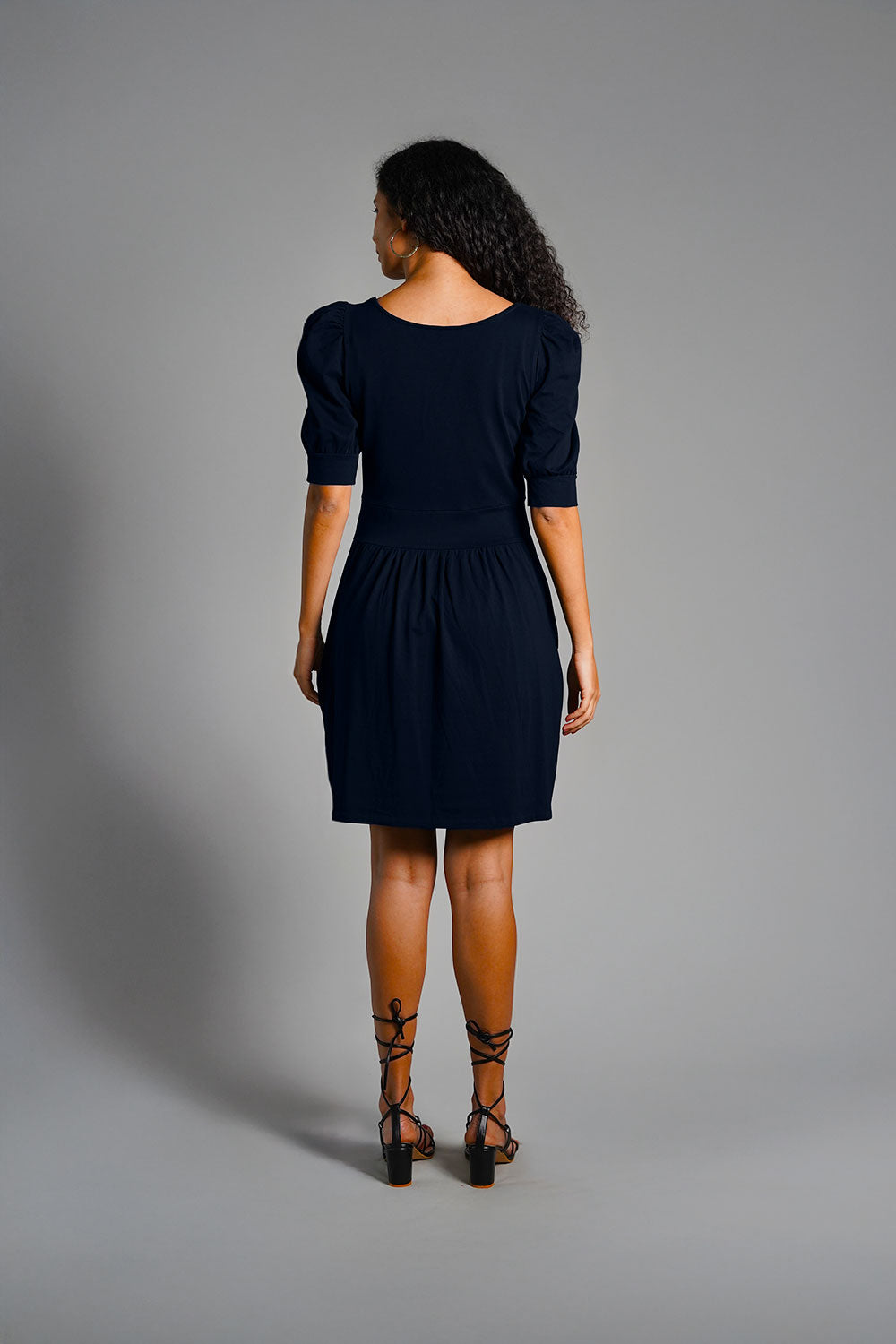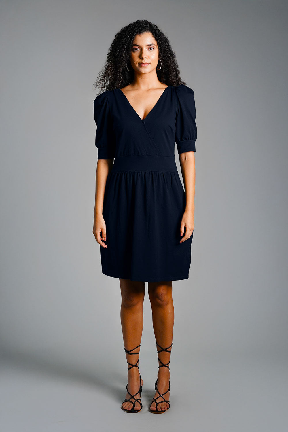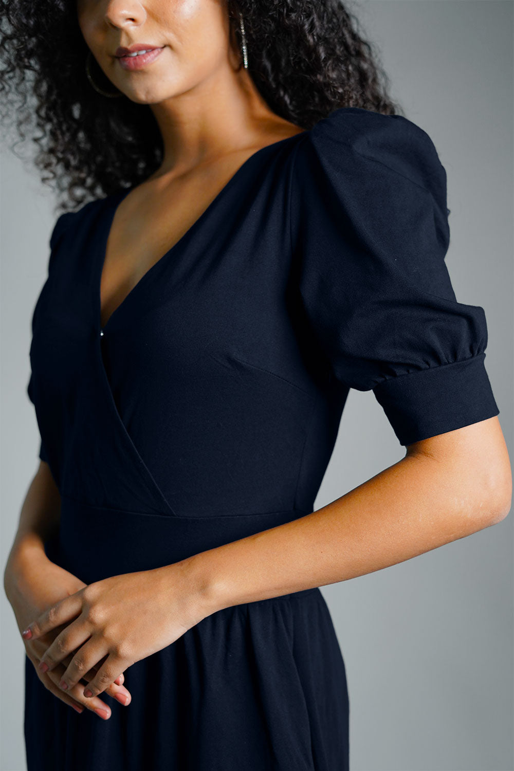 Puff Sleeve Navy Cotton Jersey Surplice Dress