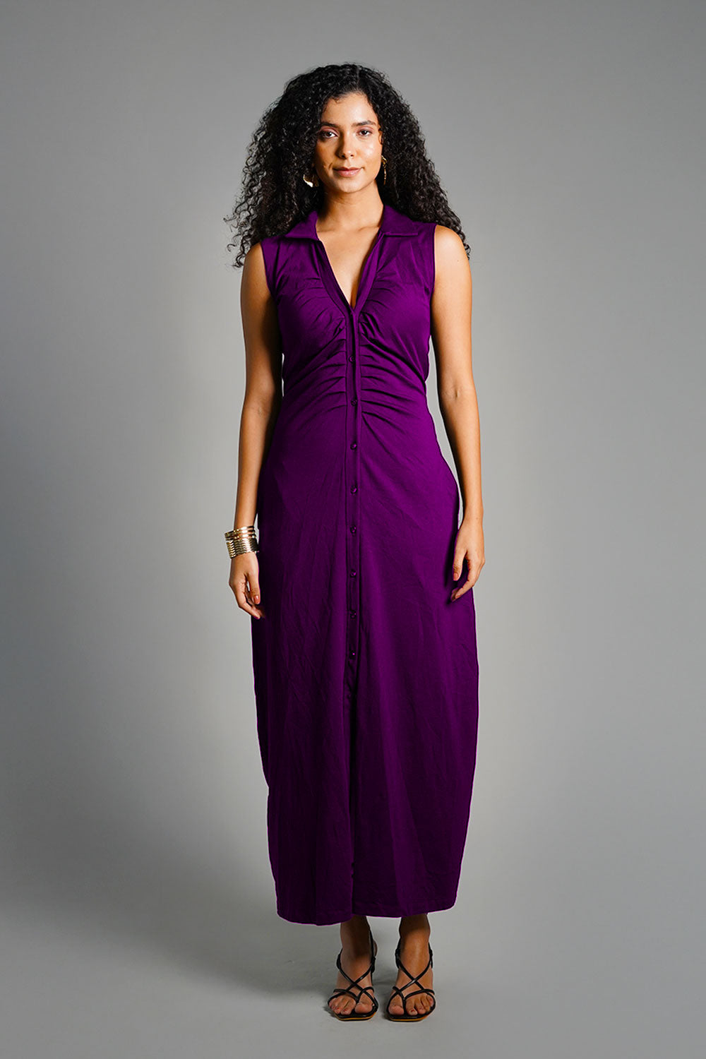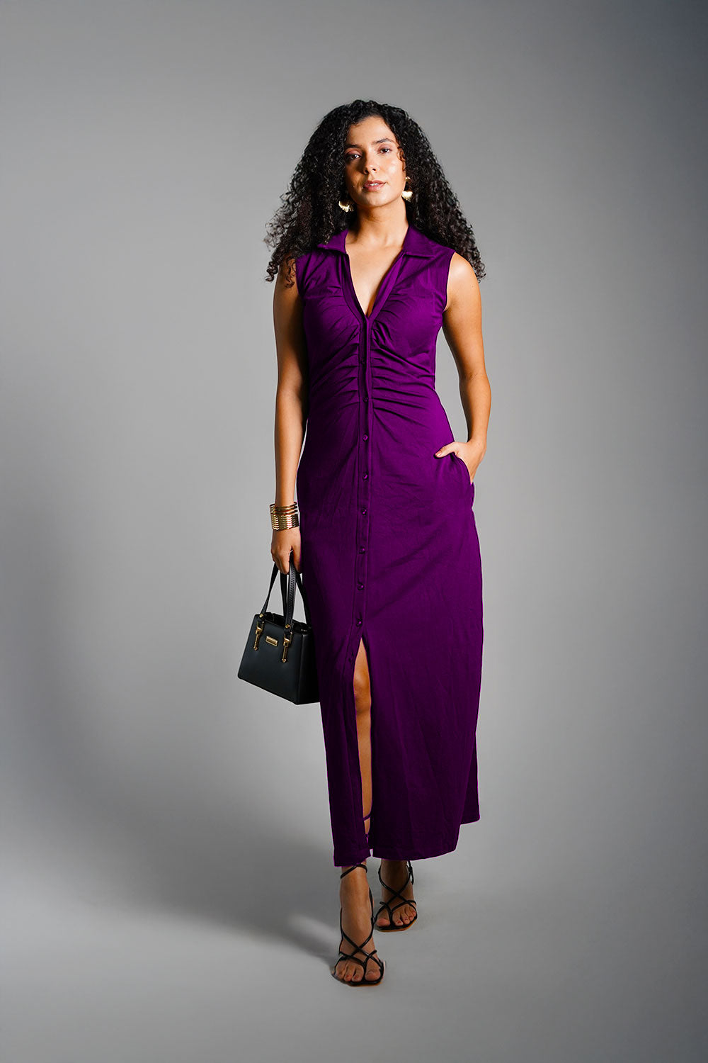Purple Ruched Cotton Jersey Tie-Back Shirt Dress