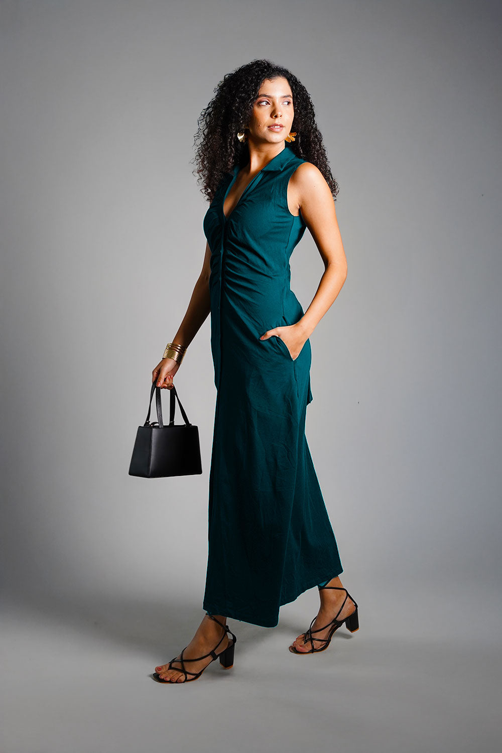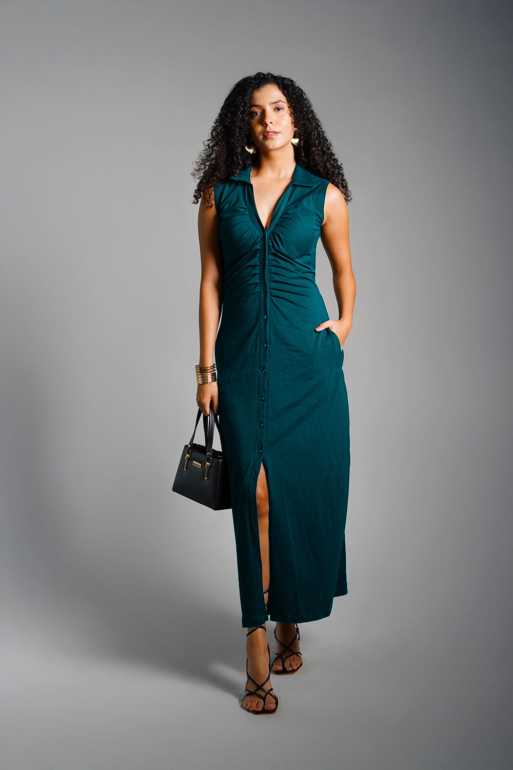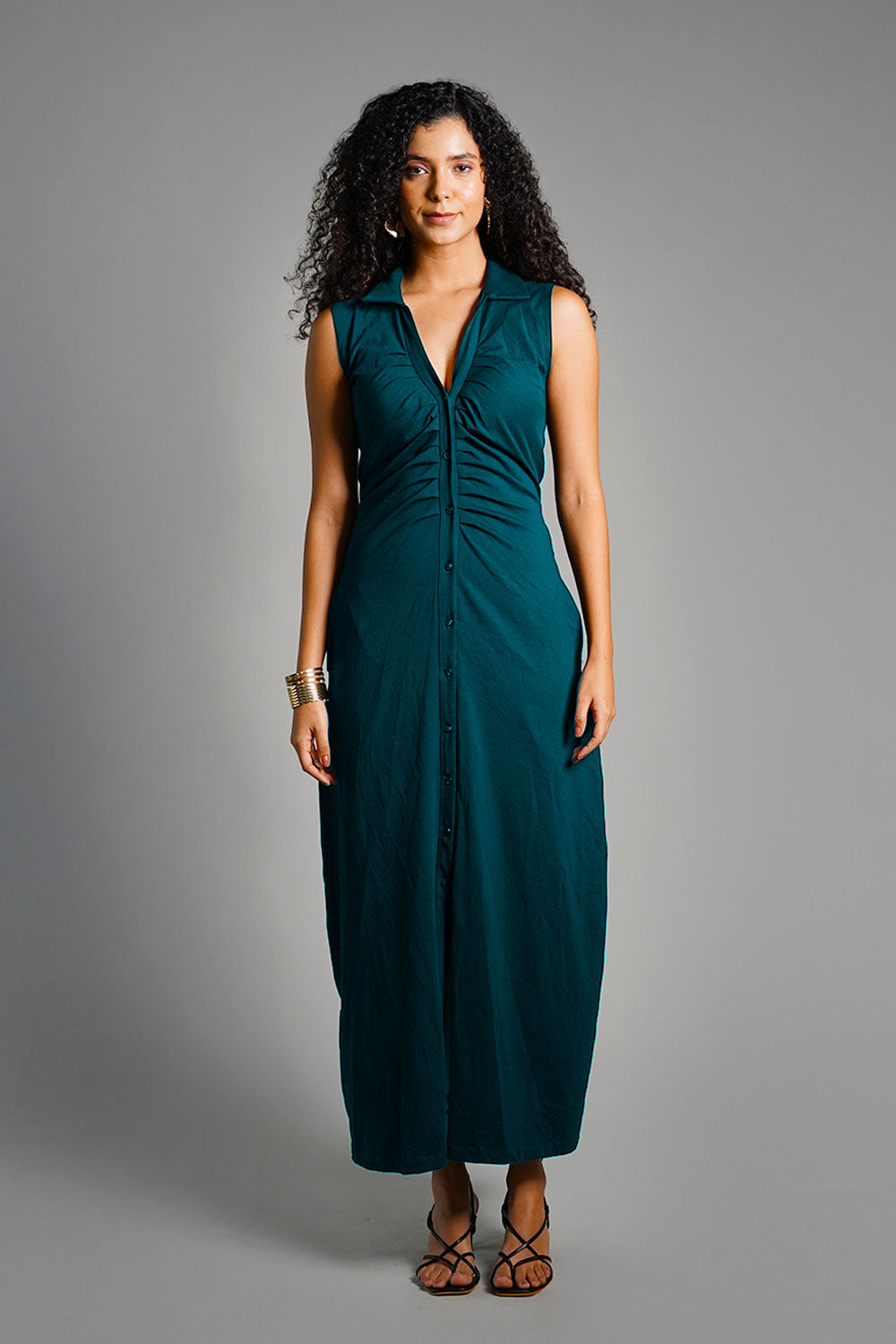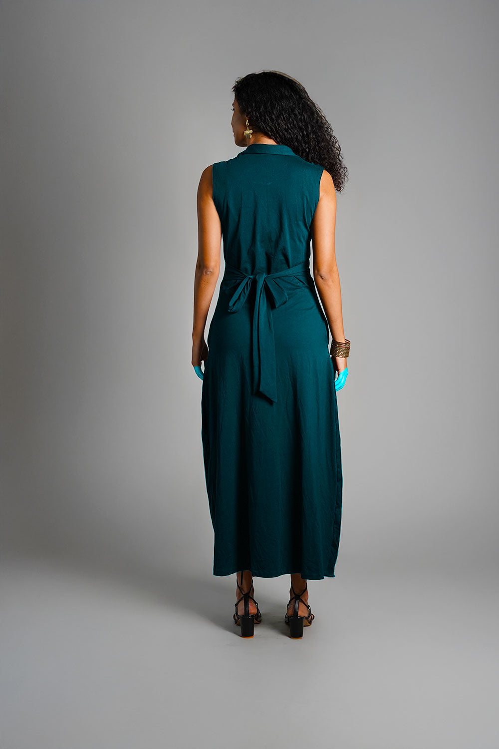 Teal Ruched Cotton Jersey Tie-Back Shirt Dress